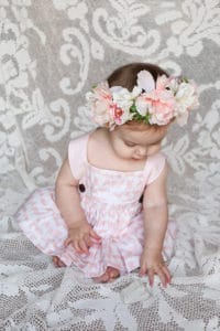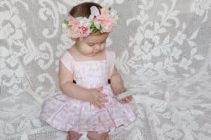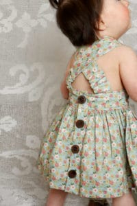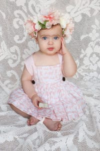 Gemia Carroll of Phat Quarters is sharing this adorable pinafore that she made for Poppie Cotton. She made 4 pinafores which were in our winning booth at International Quilt Market in October of 2018. They are absolutely adorable. Notice the detail of the buttons and the straps which are criss-crossed at the back and have elastic to hold them in place. Carol’s attention to detail shows in her beautiful workmanship. Her photos capture the sweet innocence of these babies in these gorgeous pinafores. They are so darling!