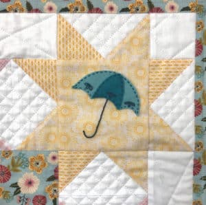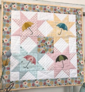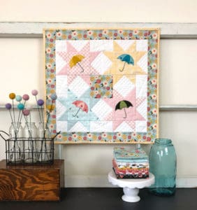 Notice the wool and embroidery detail that Amy has added inside the star blocks. Those mini umbrellas are so darling. We love anything mini … it’s always so cute when it’s tiny. The soft mints, yellows and pinks are perfectly combined to create this Springtime feeling. Makes me want to go outside and enjoy a walk and breathe in the fresh spring air … then quickly go back to my sewing machine and make this mini which you can find everything you need to know here.