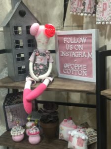 Our shelves are filled with many of the projects and patterns from both collections featured…Wanderings and Gingham Farmhouse. You can see the cute bunny bins at the top which have flowers in them…they would be so sweet in a childs nursery…there is a house needle-book…scrappy bins with embroidery…house pin cushions…and our course, our sweet Poppie!