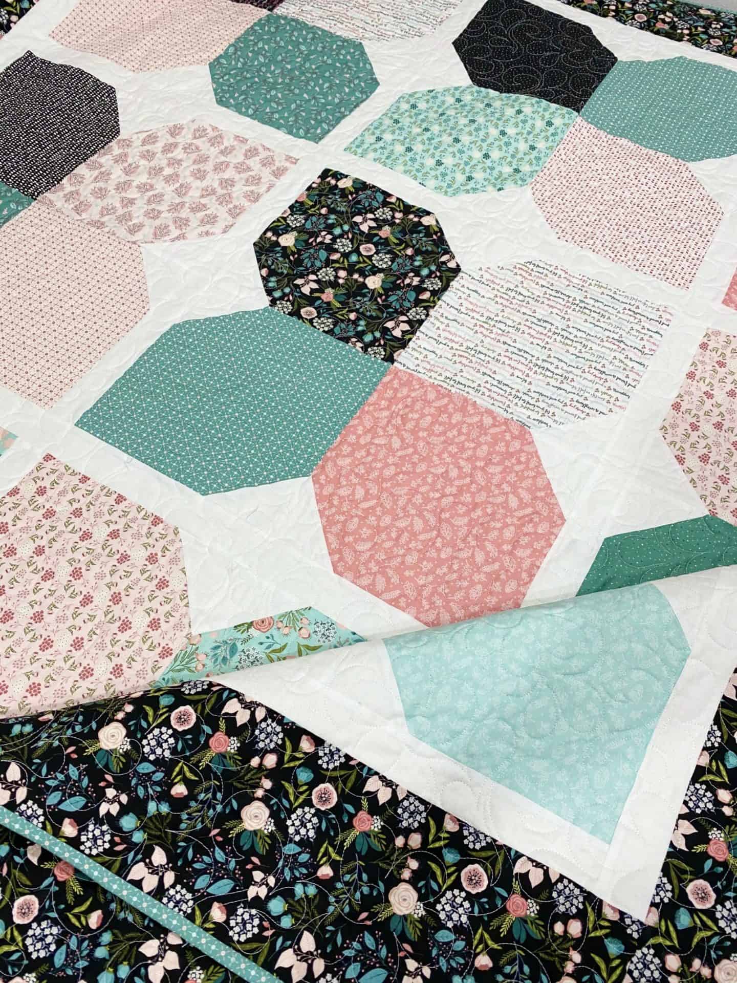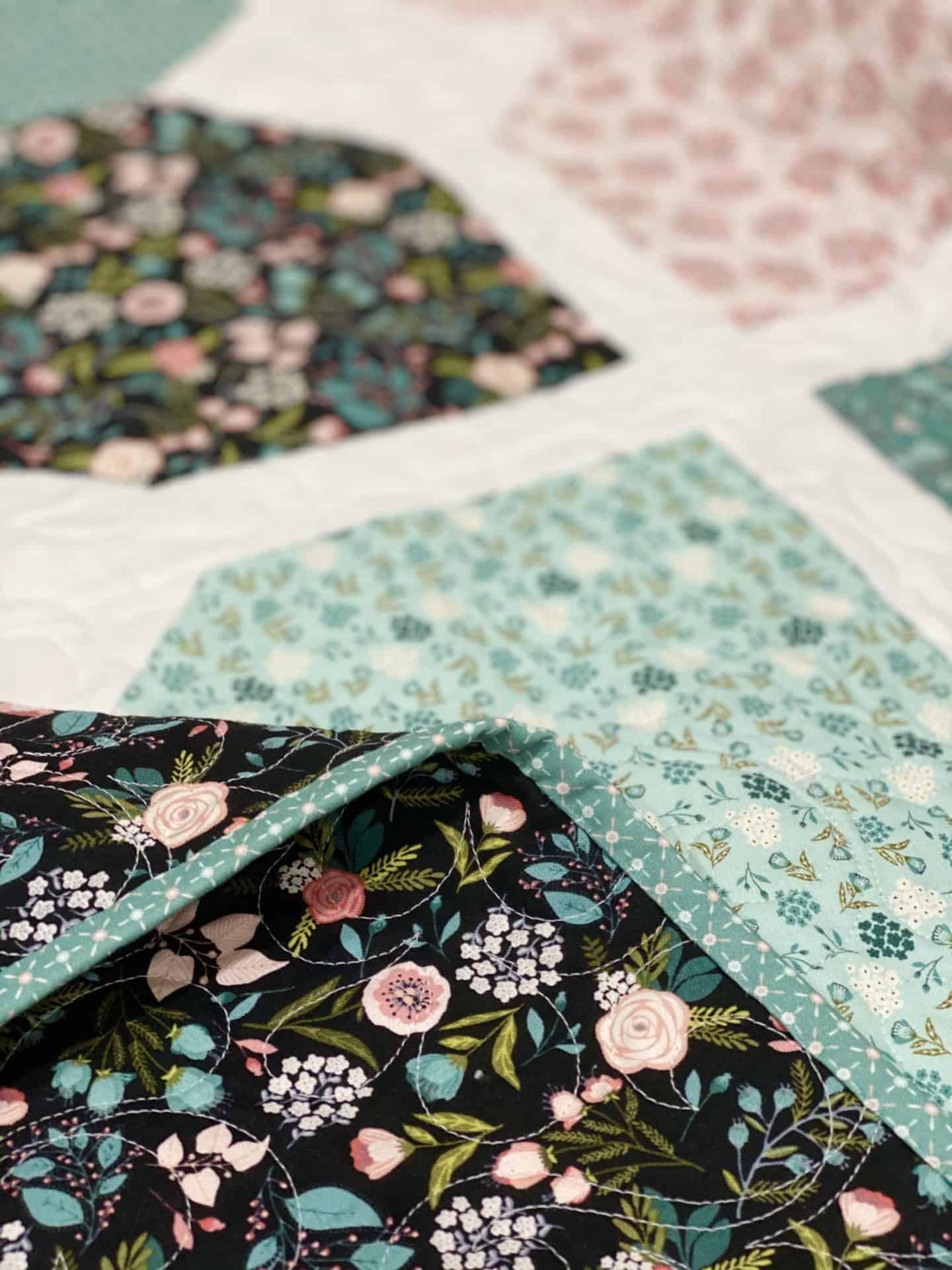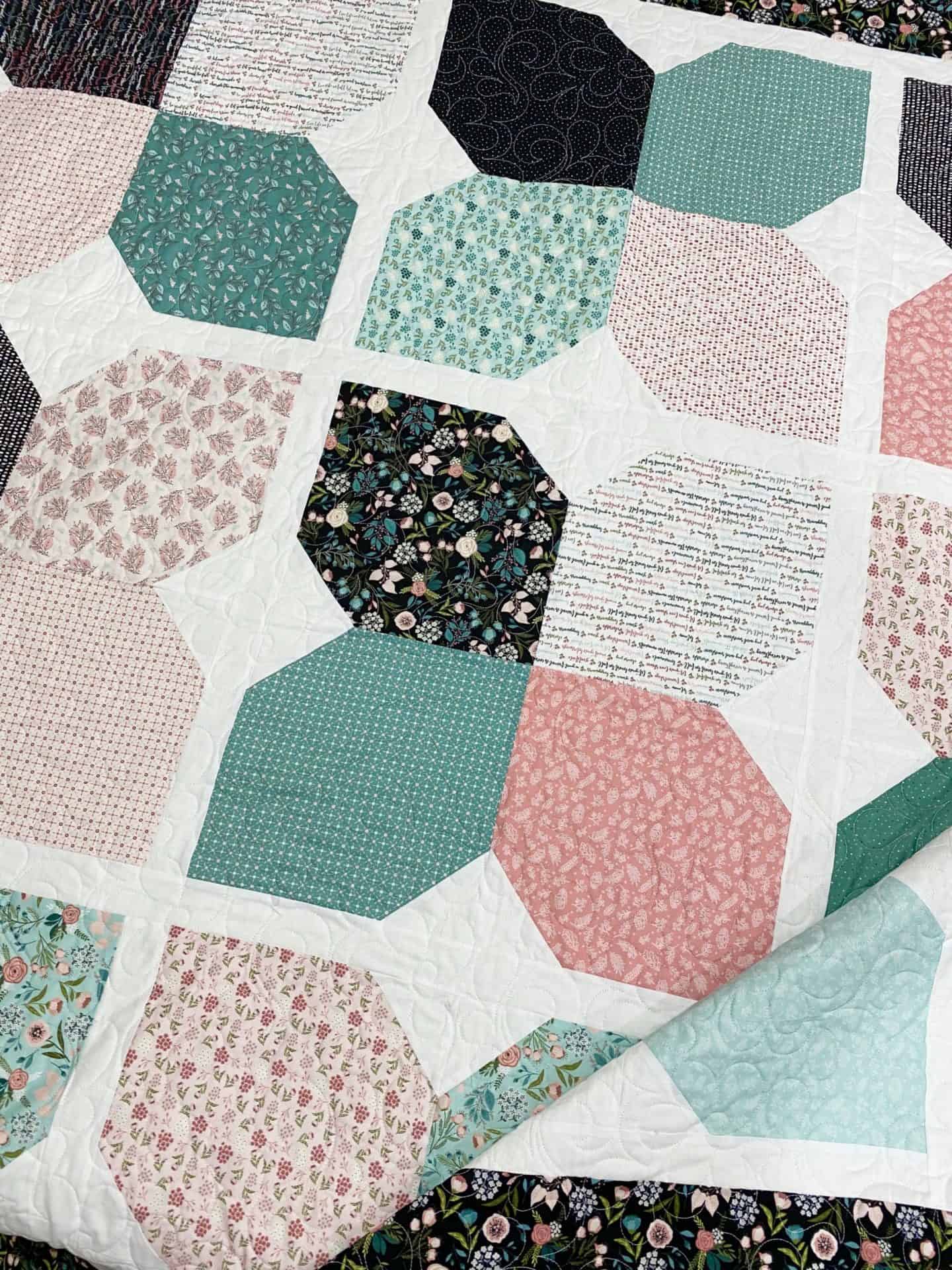 Lindsey from Primrose Cottage Quilts has made the most beautiful pattern and quilt. We love this big block that allows the beautiful fabrics in Cherished Moments to show off all their glory. This fabric collection is full of all shades of pink, mint, teal and the surprise color of black. The combination of this pattern and fabrics is stunning!