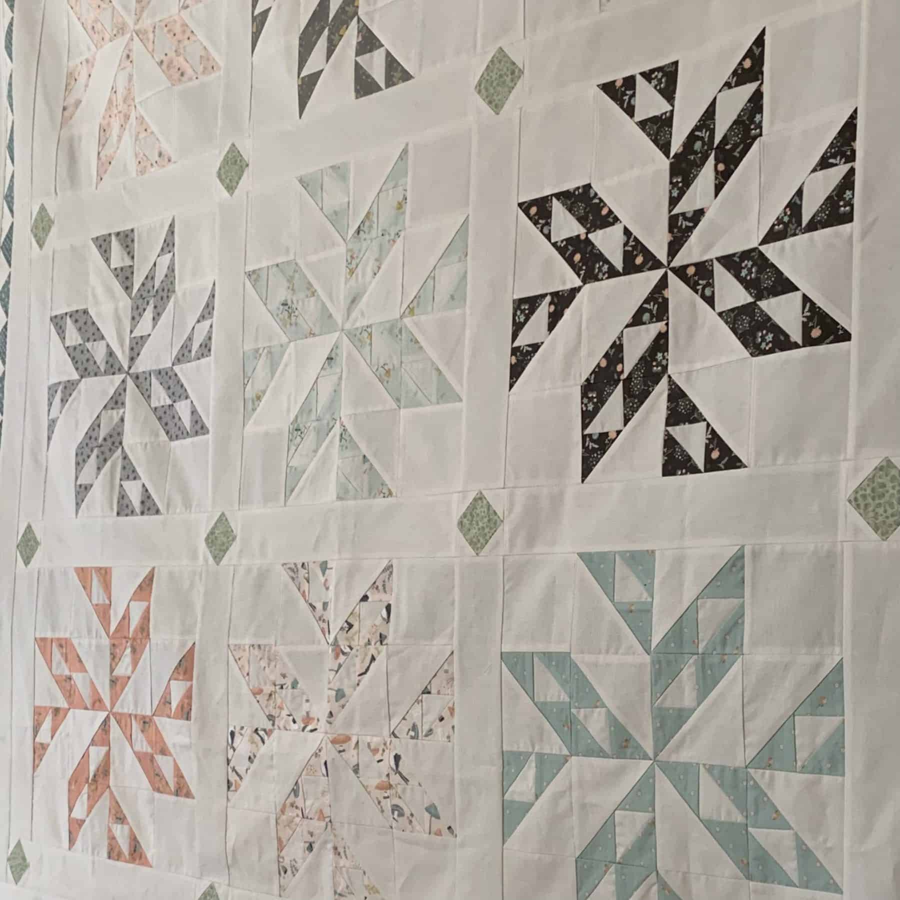 Anna chose the nine-block version of Star Struck and selected nine prints for the stars. The soft, pale aqua and peach prints combined with the darker corals and grays give this quilt a very dainty, even low volume look. We love this quilt so much!