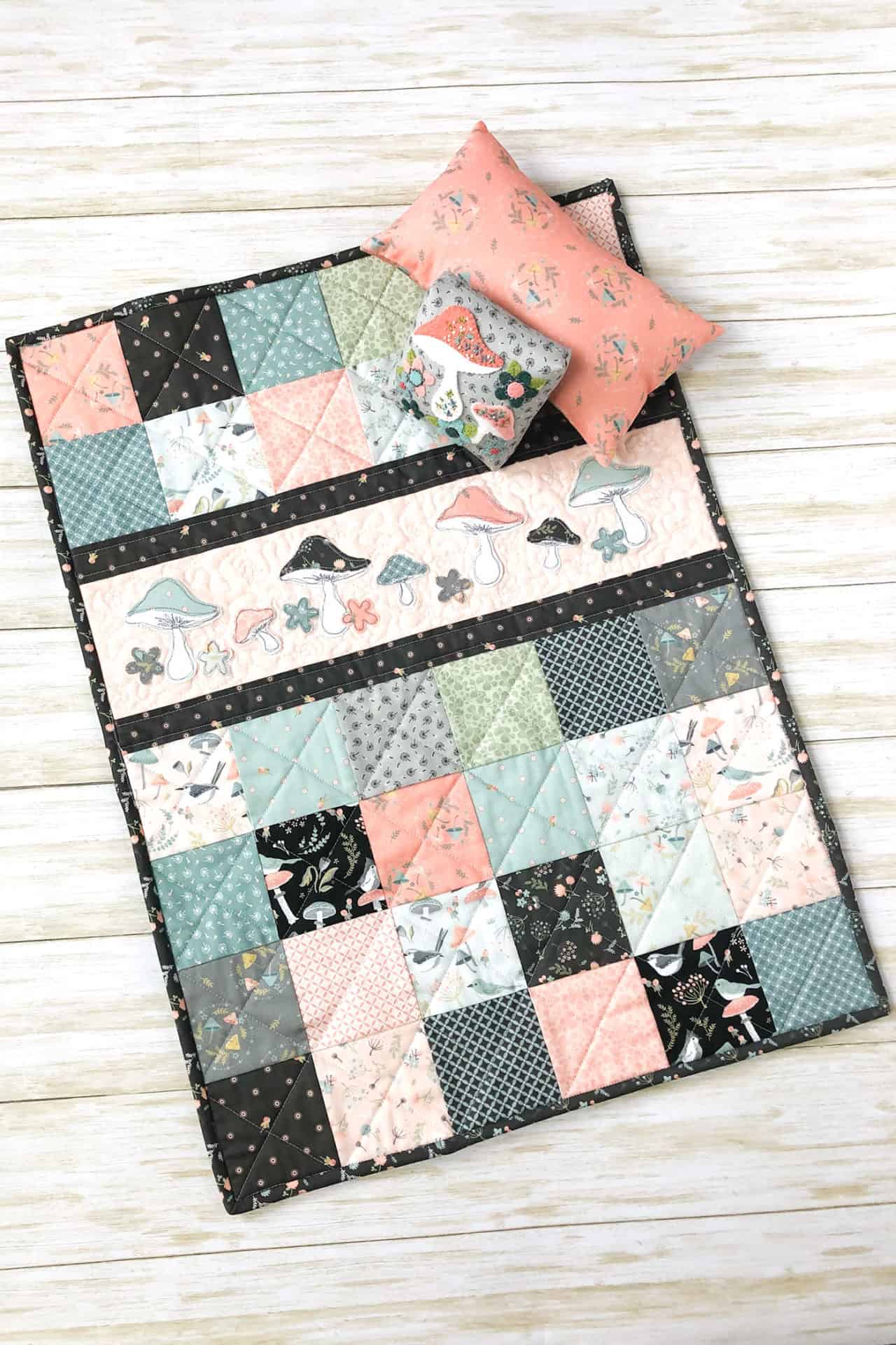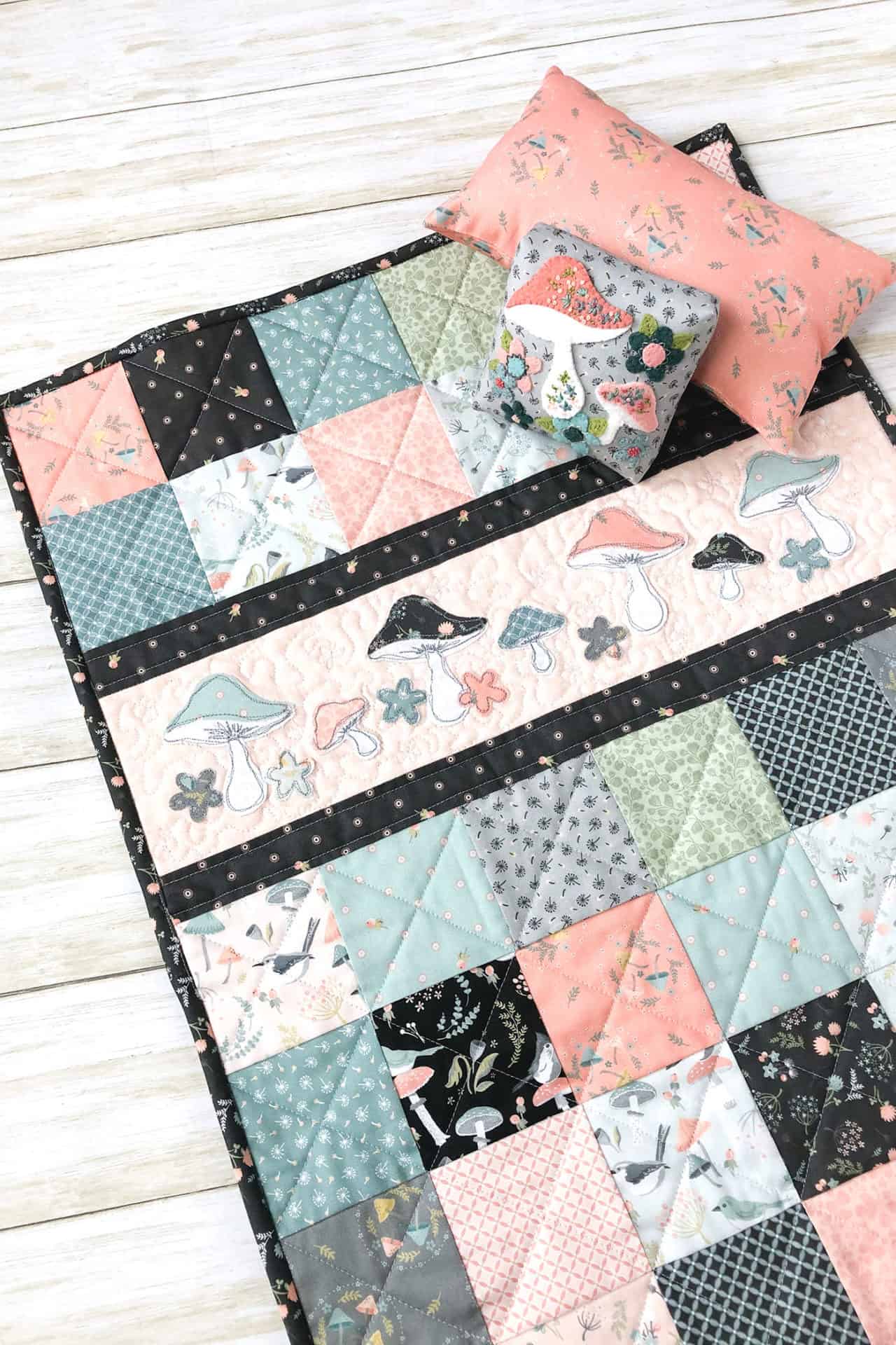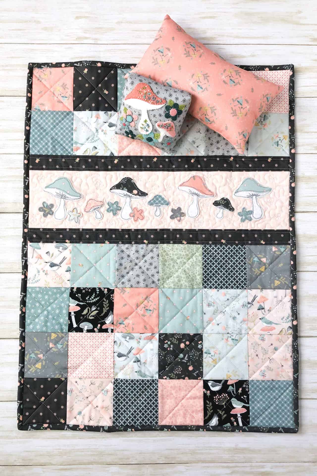 All the sweet prints and designs from Woodland Songbirds work so well together. The row of mushrooms and flowers along the middle of the quilt create a beautiful border, where your eye stops to look at the cute tiny details. Amy has used her machine with a gray thread to give the fabric mushrooms the detail of a mushroom growing in the wilderness. They look hand drawn. We love every little detail.