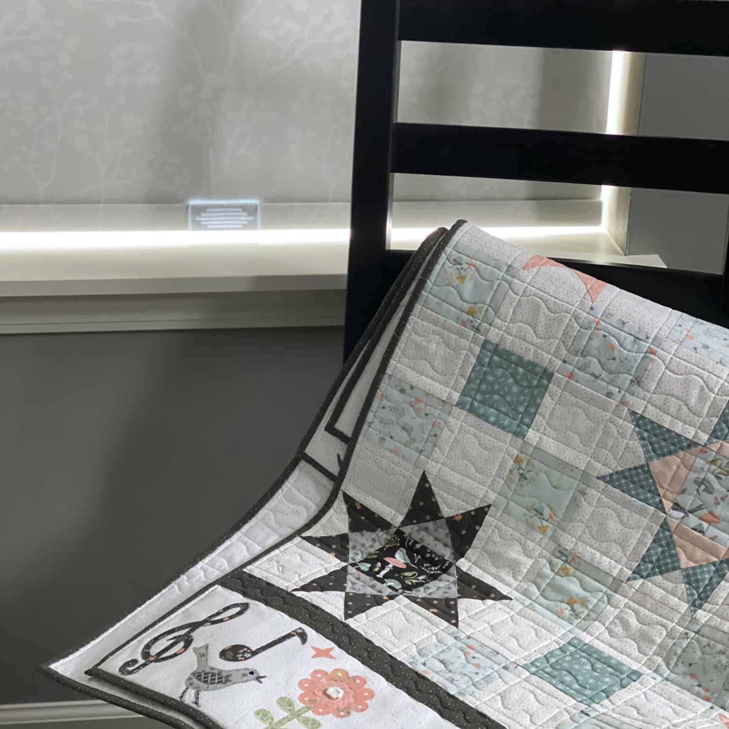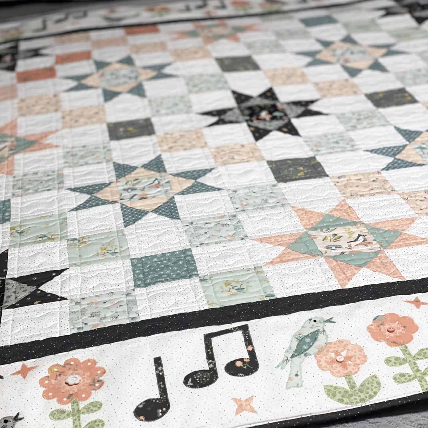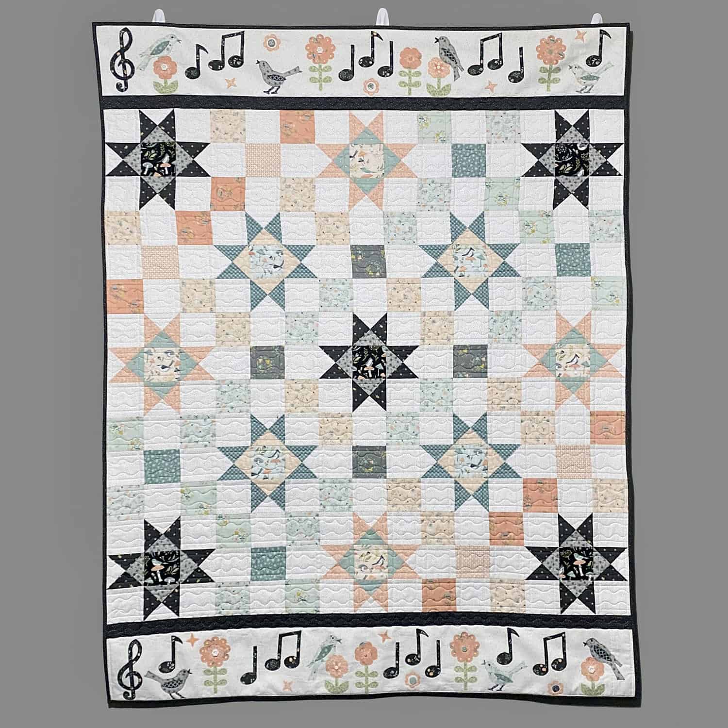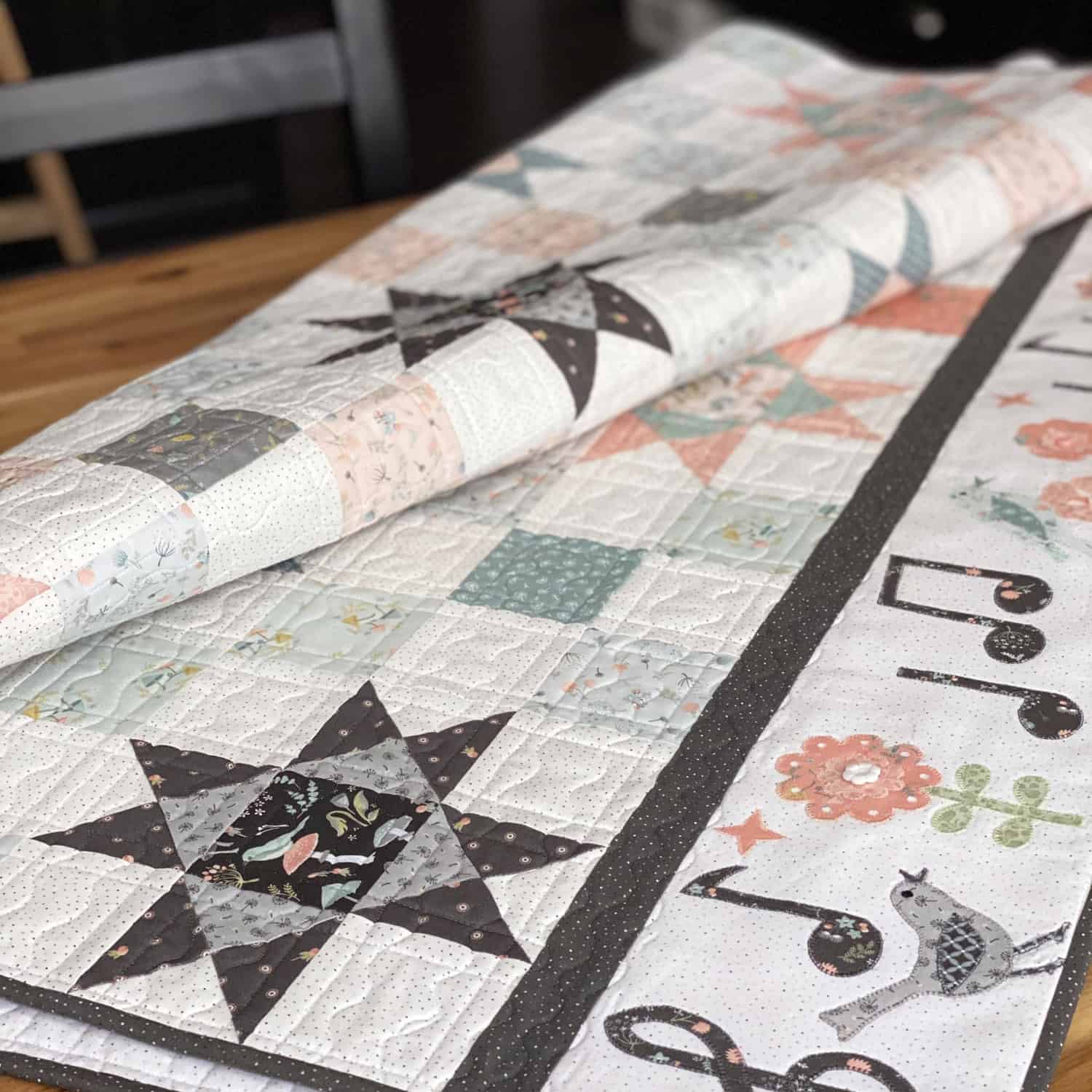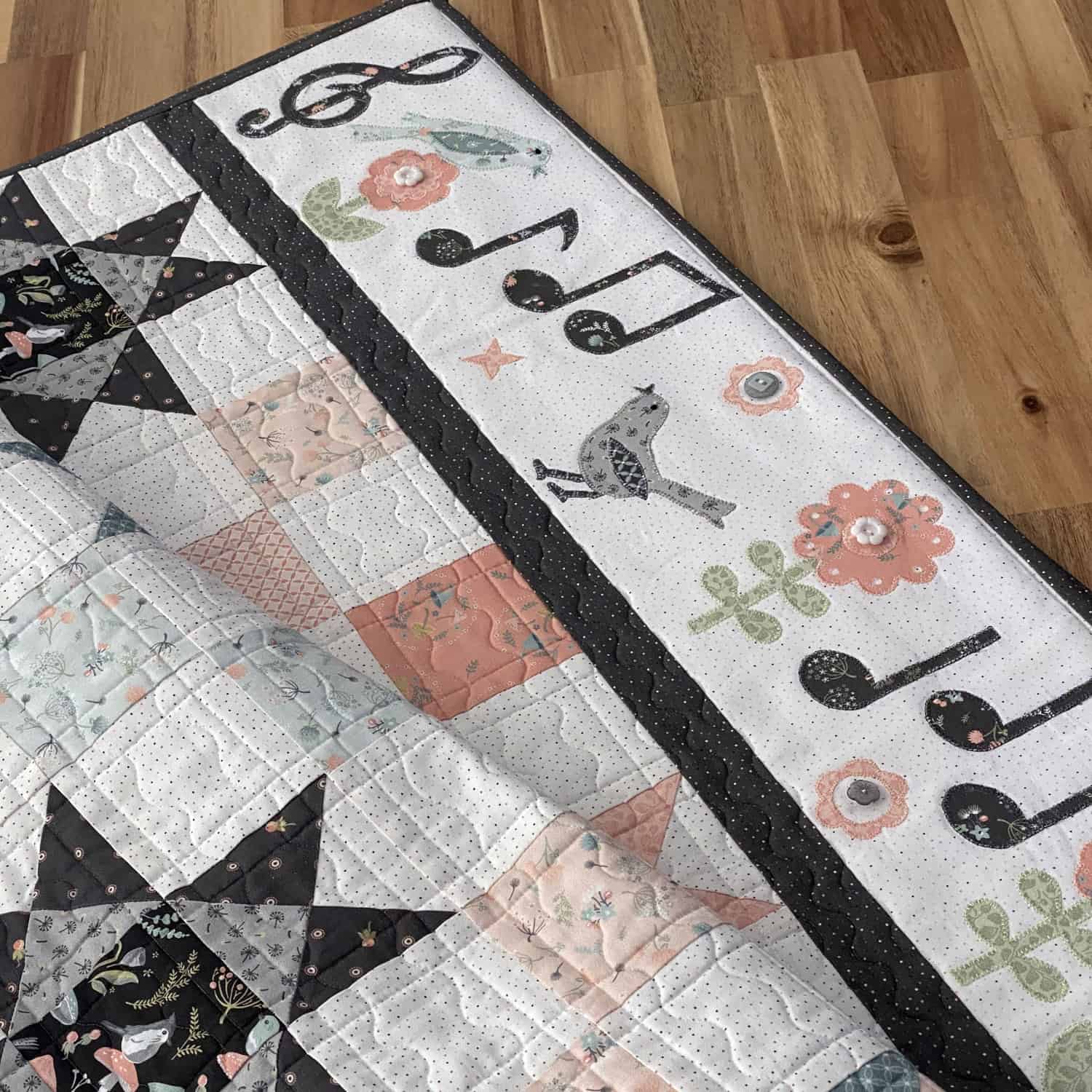 Notice how Belinda has used the dark grays to contrast with all the soft pastel prints in the Woodland Songbirds fabric collection… yummy peaches and soft mints.