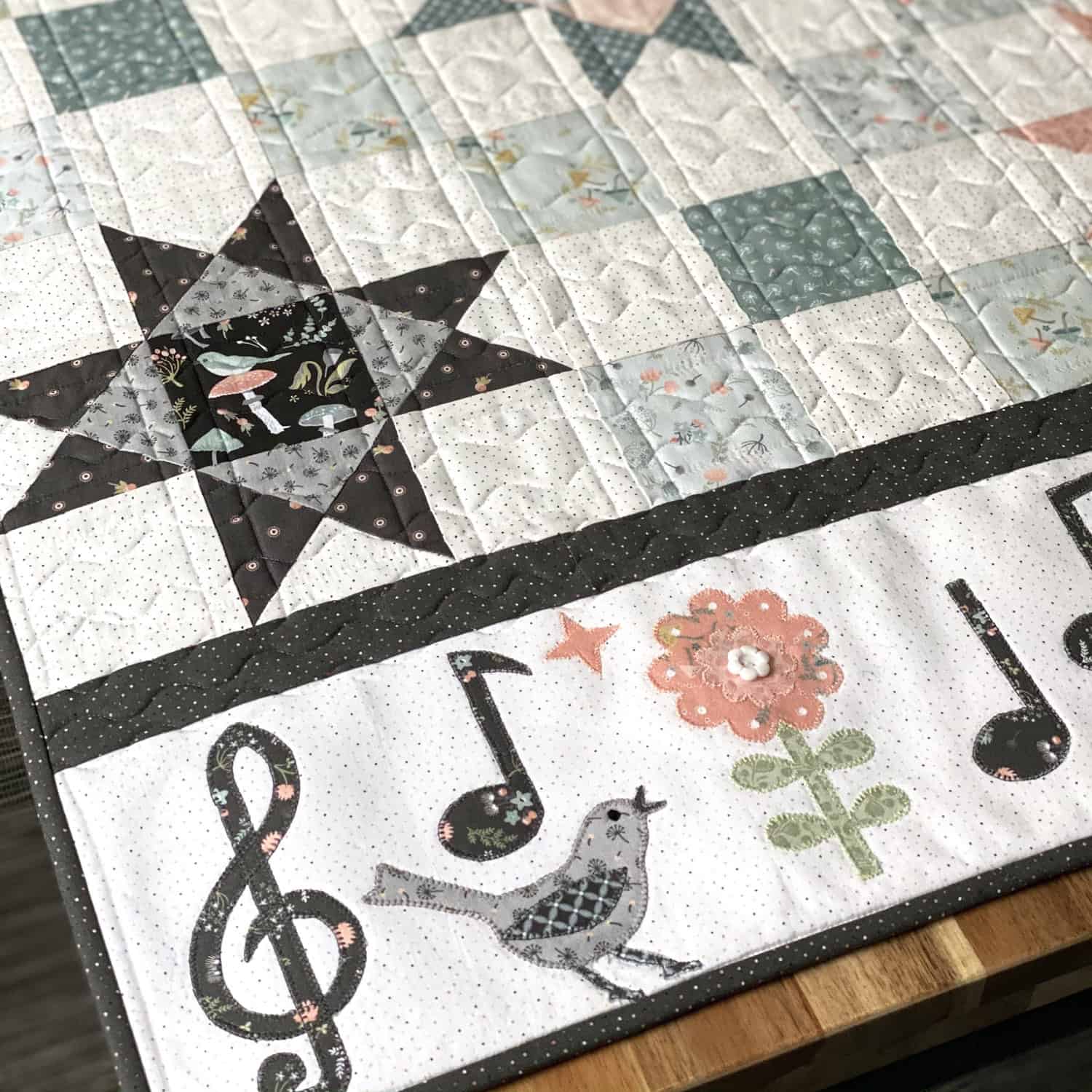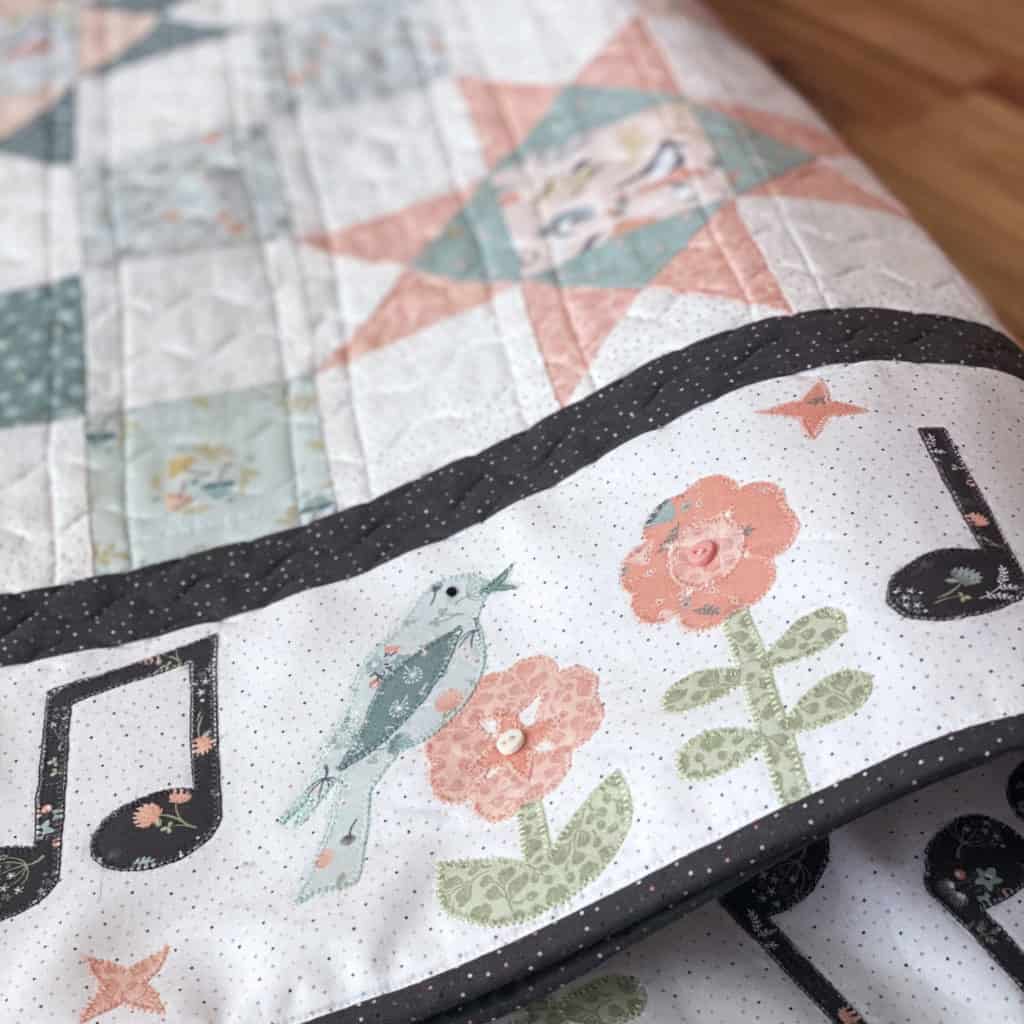 The applique flowers, music notes, birds and stars… sing a sweet melody in our ears and make us want to sit and stitch a while. Love the cute button centers inside the flowers!
