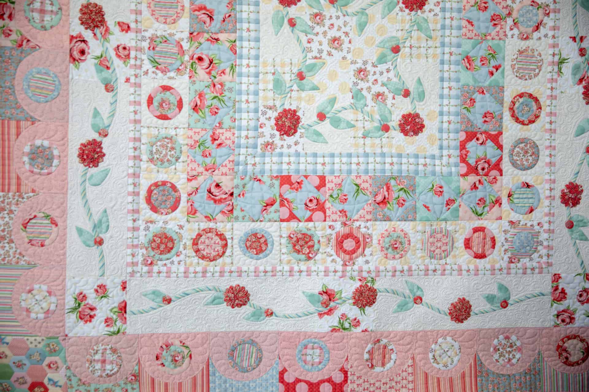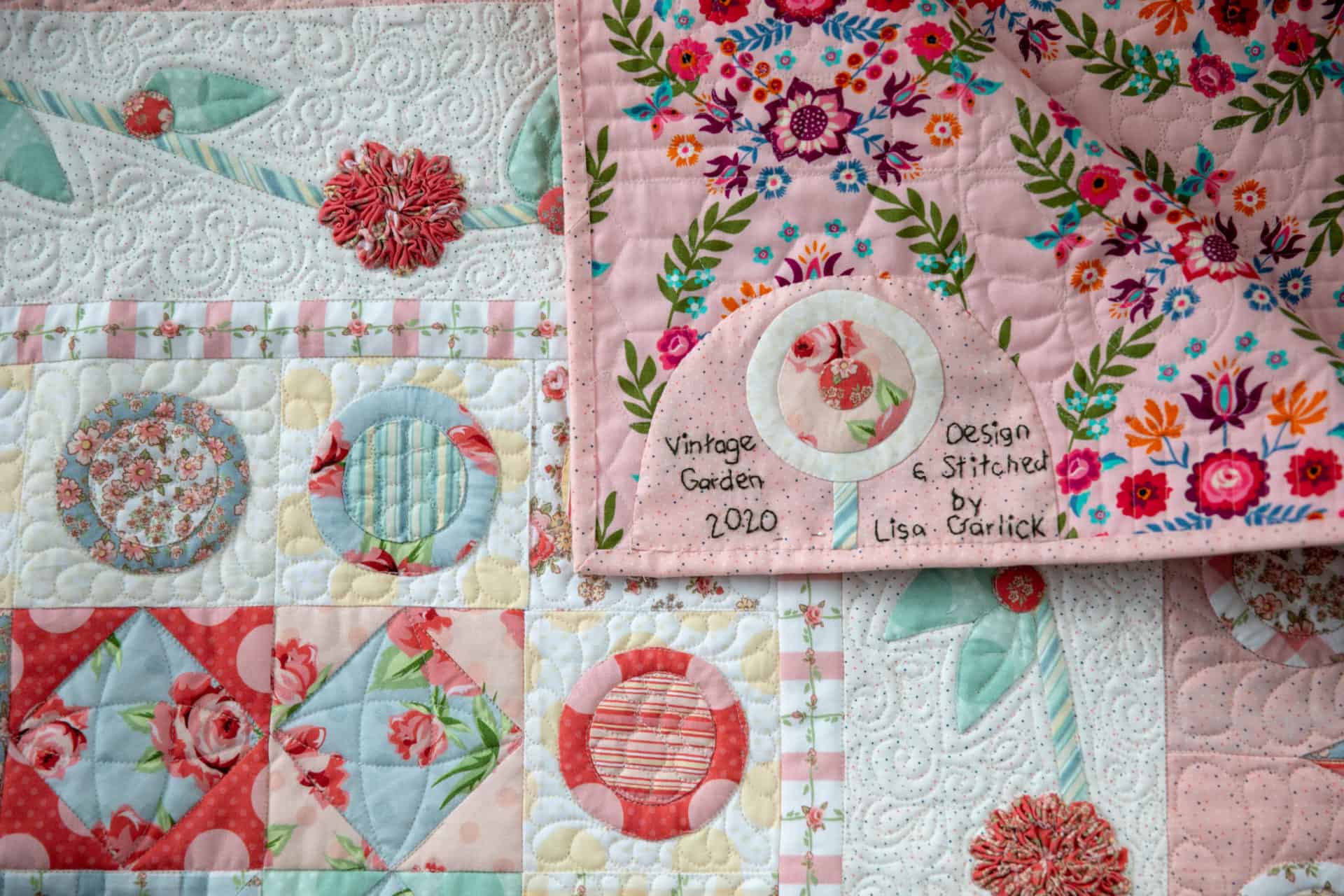 Looking at closeups of the quilting, hand appliqué and detailed ruching are just so beautiful. We cannot get over the beauty of this Vintage Garden quilt… and to top it off the label on the back is just as cute. Hand-stitched with love in every detail.