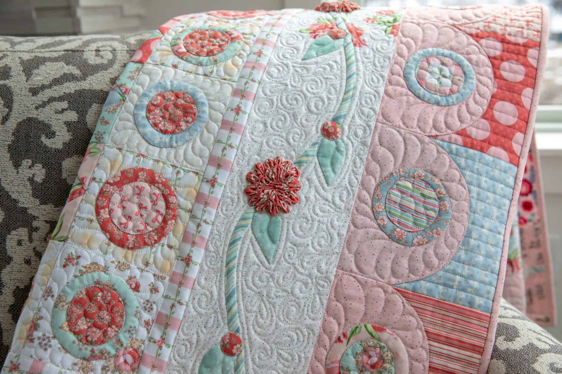 Could you just die over all the amazing details in this quilt… we are so in love. The longarm quilting is all done by Lisa… she is extremely talented and has such a great eye for detail! We love the contrast in colors that she has created with Dots and Posies… from the whites to the pinks and the highlights of blue and green… it’s all beautiful!