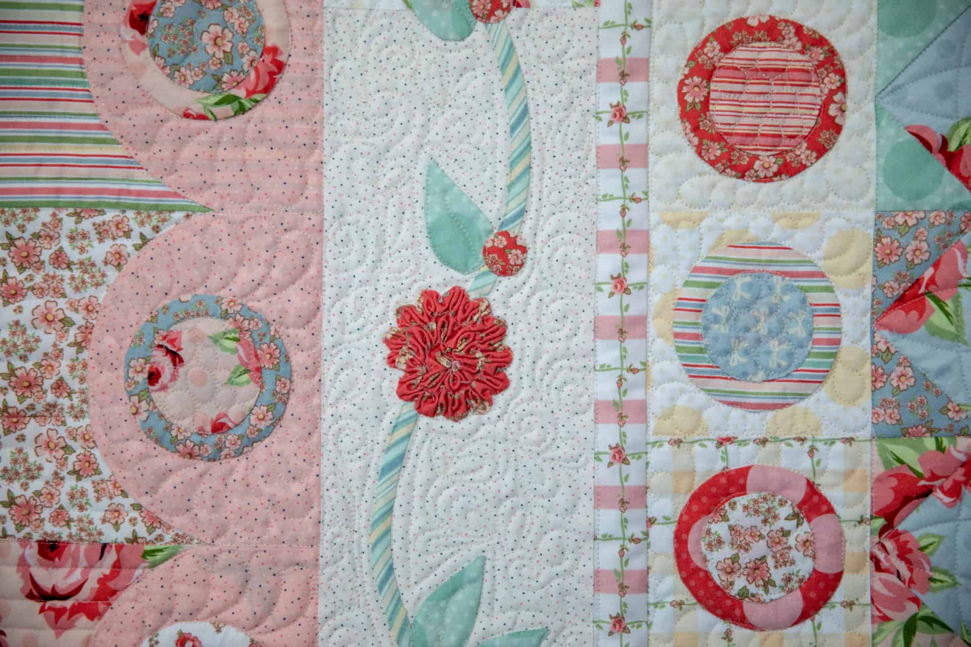 Looking at closeups of the quilting, hand appliqué and detailed ruching are just so beautiful. We cannot get over the beauty of this Vintage Garden quilt… and to top it off the label on the back is just as cute. Hand-stitched with love in every detail.