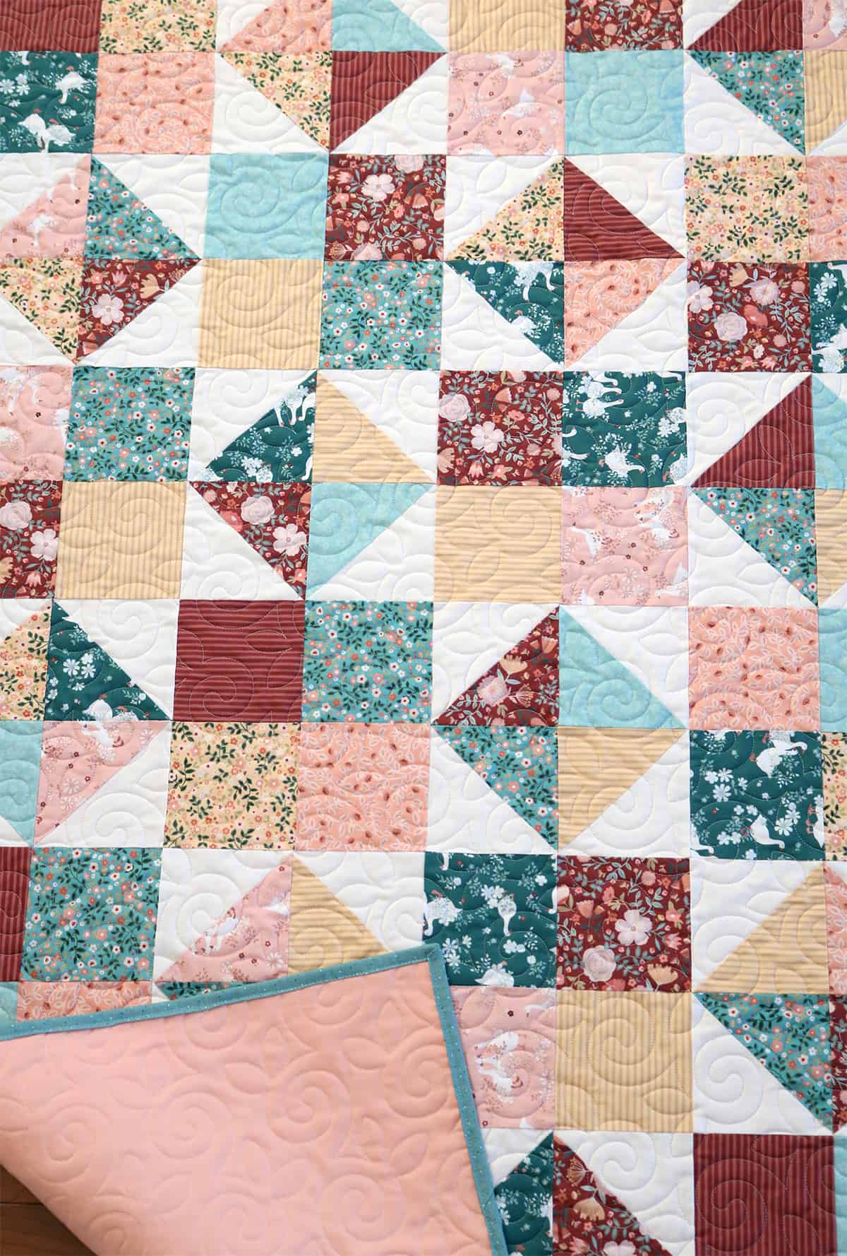 Four Patch Spin is a fun mix of easy-to-piece Four Patch blocks, and Broken Dishes blocks – made of half square triangles. It is a free download pattern here.
