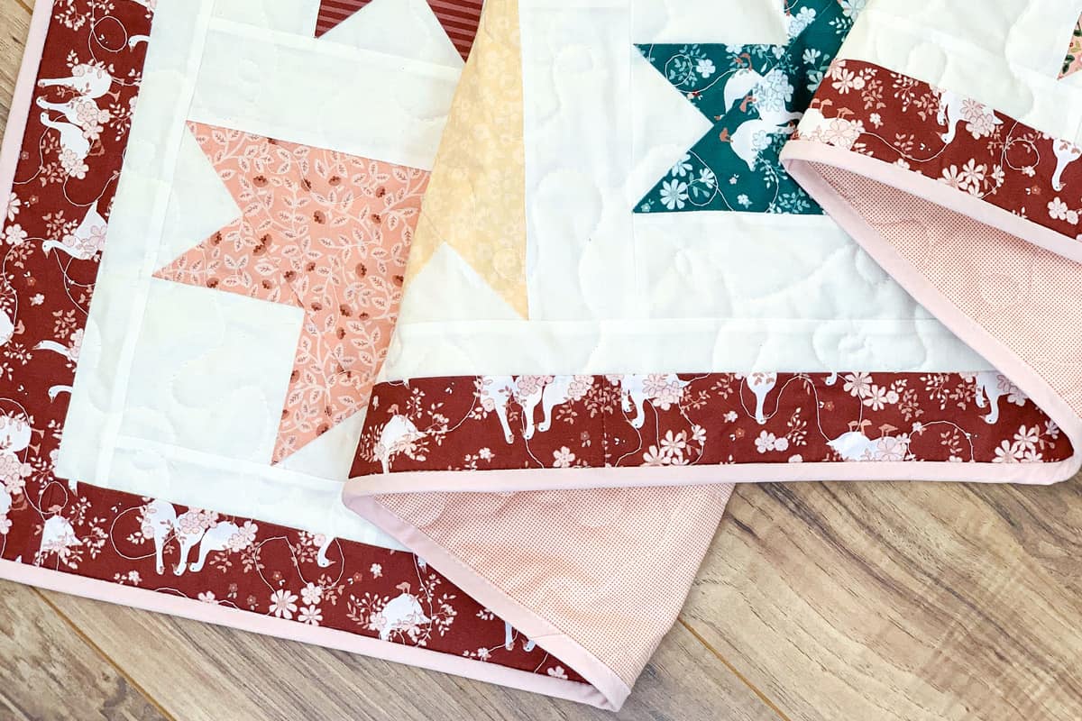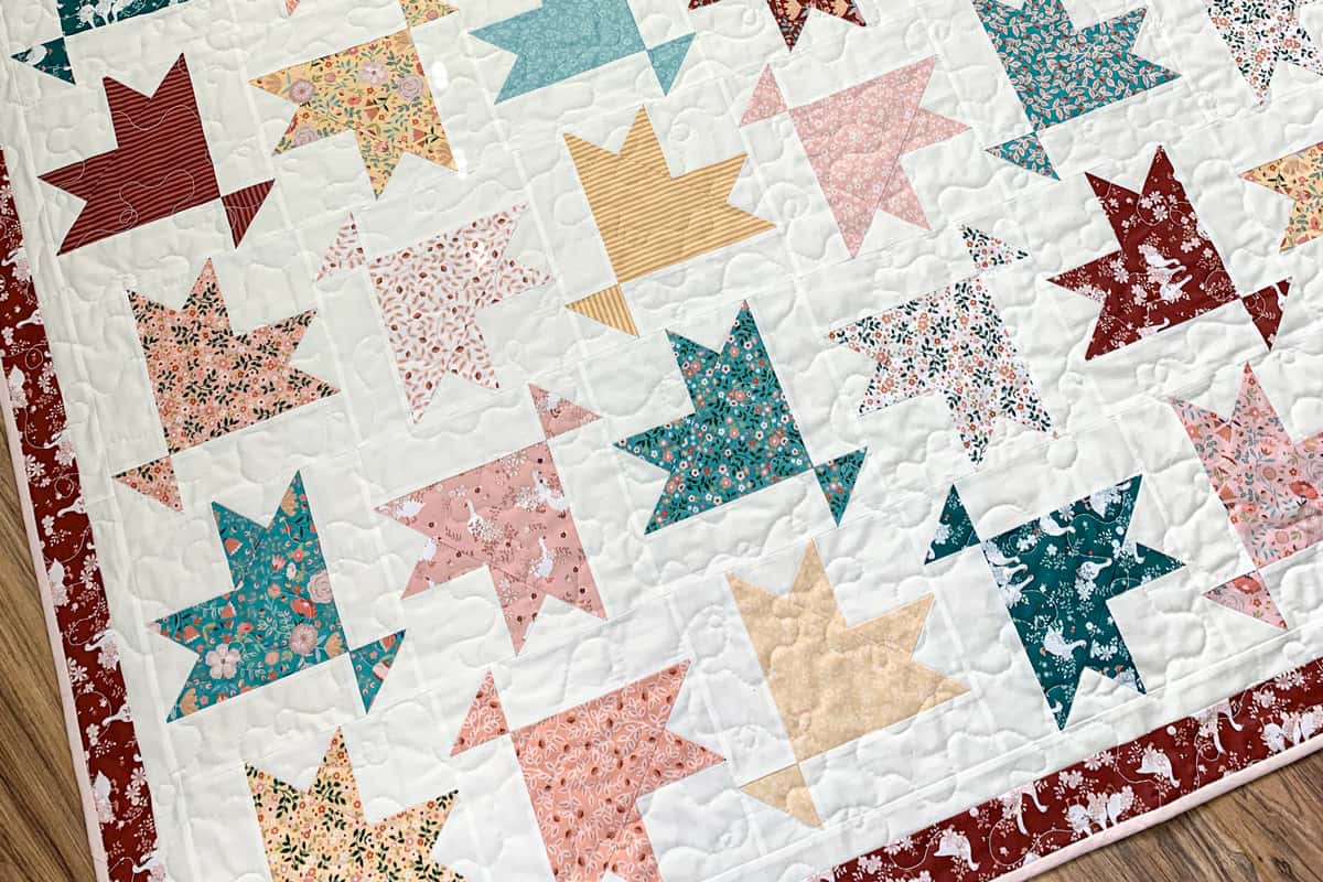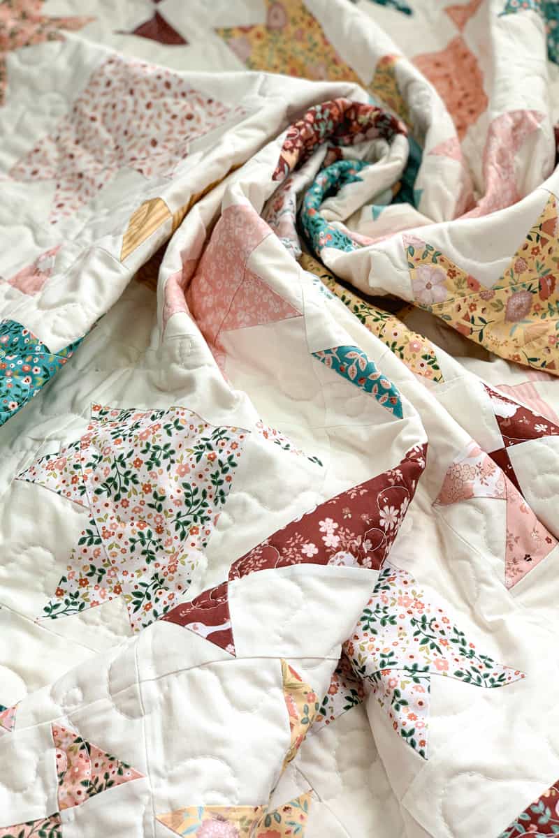 This quilt finishes at 62” x 70”. A nice lap size. For a larger quilt size you could continue making blocks and add rows.