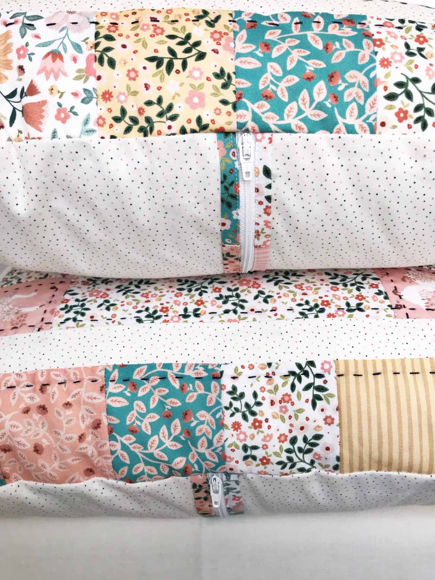 Pillows are a quick way to spruce up your home for springtime. They can brighten a room in a jiffy… LOVE, LOVE, LOVE the element of adding hand stitching to any fabric project! Notice the zippers on the back of the pillows… they make such a tidy back for any pillow and add an element of surprise.