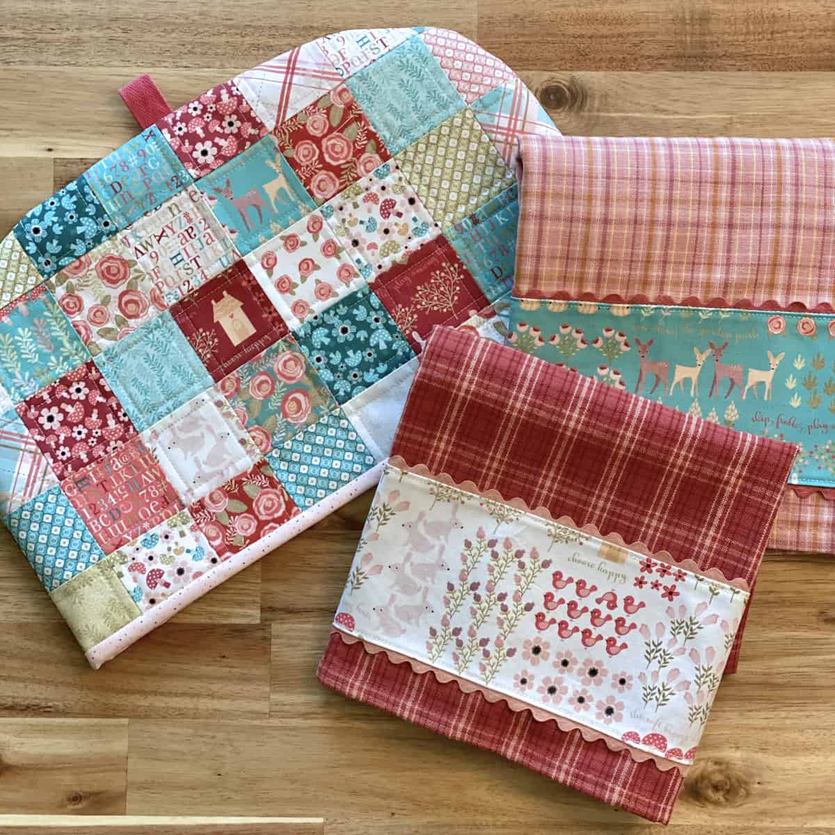 We love the hints of ric rac throughout all her projects. The main print with the cute bunnies and flower patches is so adorable on these dish towels.